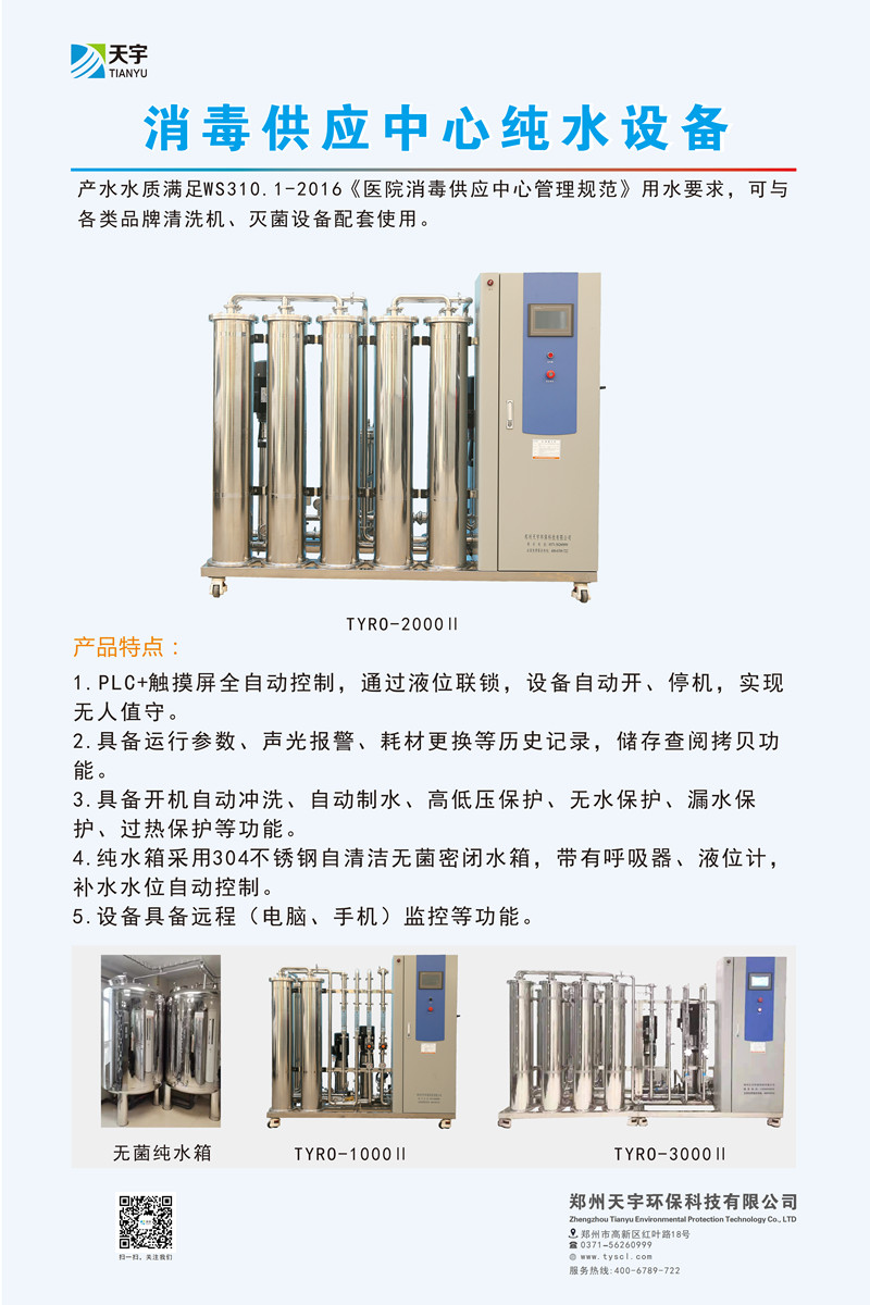 郑州天宇环保科技有限公司作为消毒供应中心医用水系统领域优秀供应商,将携公司产品医院智慧水系统、GMP纯化水系统、高端医用纯水设备、酸化水系统等产品将重磅亮相,为消毒供应中心提高医疗用水整体解决方案。